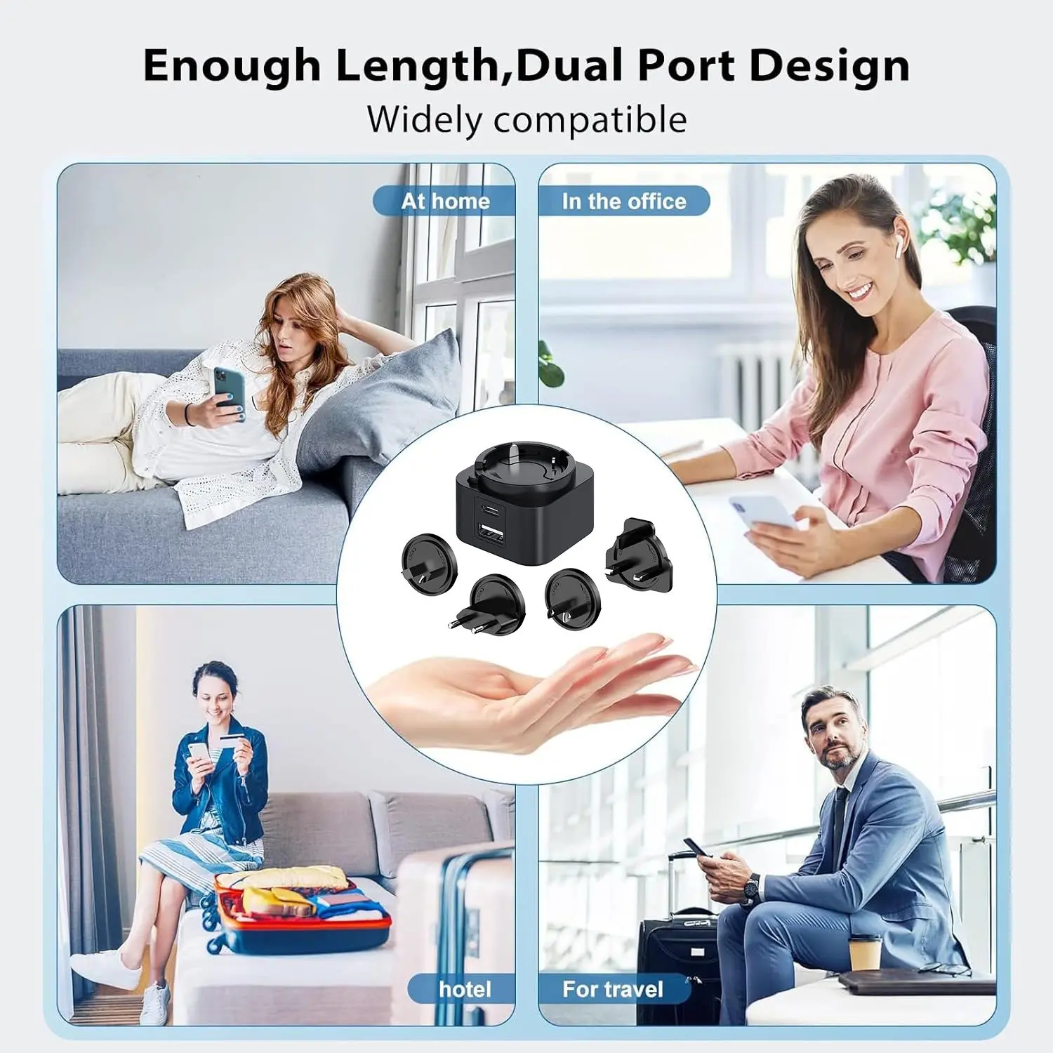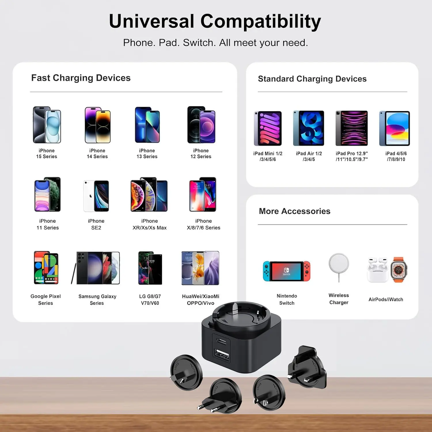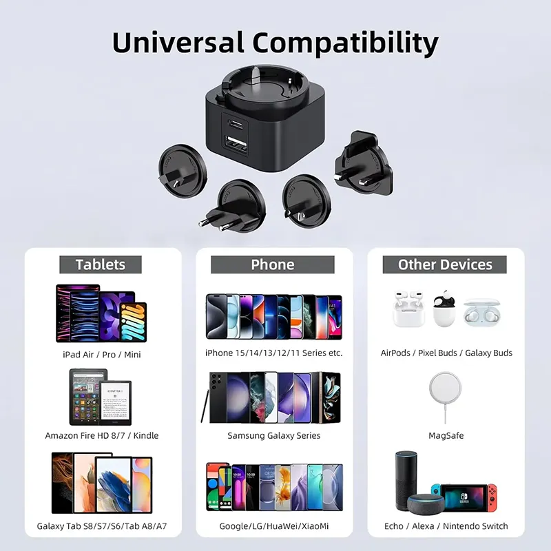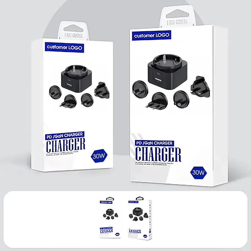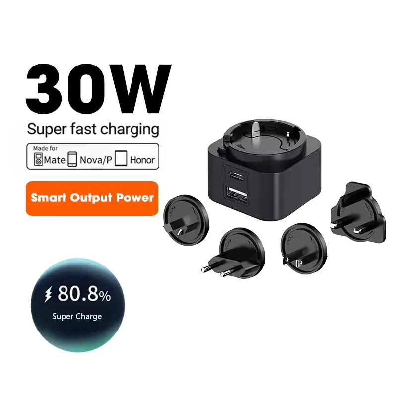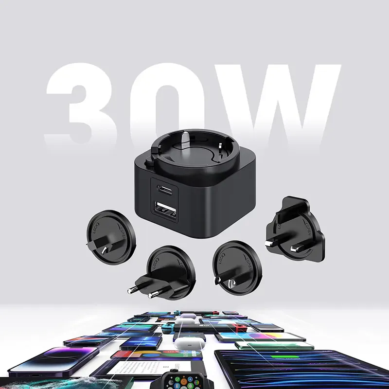 Η ευελιξία είναι το κλειδί. Ο σχεδιασμός διπλής θύρας (USB-C/USB-A) σας επιτρέπει να φορτίζετε δύο συσκευές ταυτόχρονα. Ο φορτιστής PD με εναλλάξιμα βύσματα 30W διαθέτει ένα σετ εναλλάξιμων βυσμάτων (ΗΠΑ/ΕΕ/ΗΒ/ΑΕ), καθιστώντας τον τον τέλειο σύντροφό σας για ταξίδια σε όλο τον κόσμο. Είτε φορτίζετε smartphone, tablet ή φορητό υπολογιστή, η καθολική συμβατότητα εξασφαλίζει κορυφαία απόδοση.