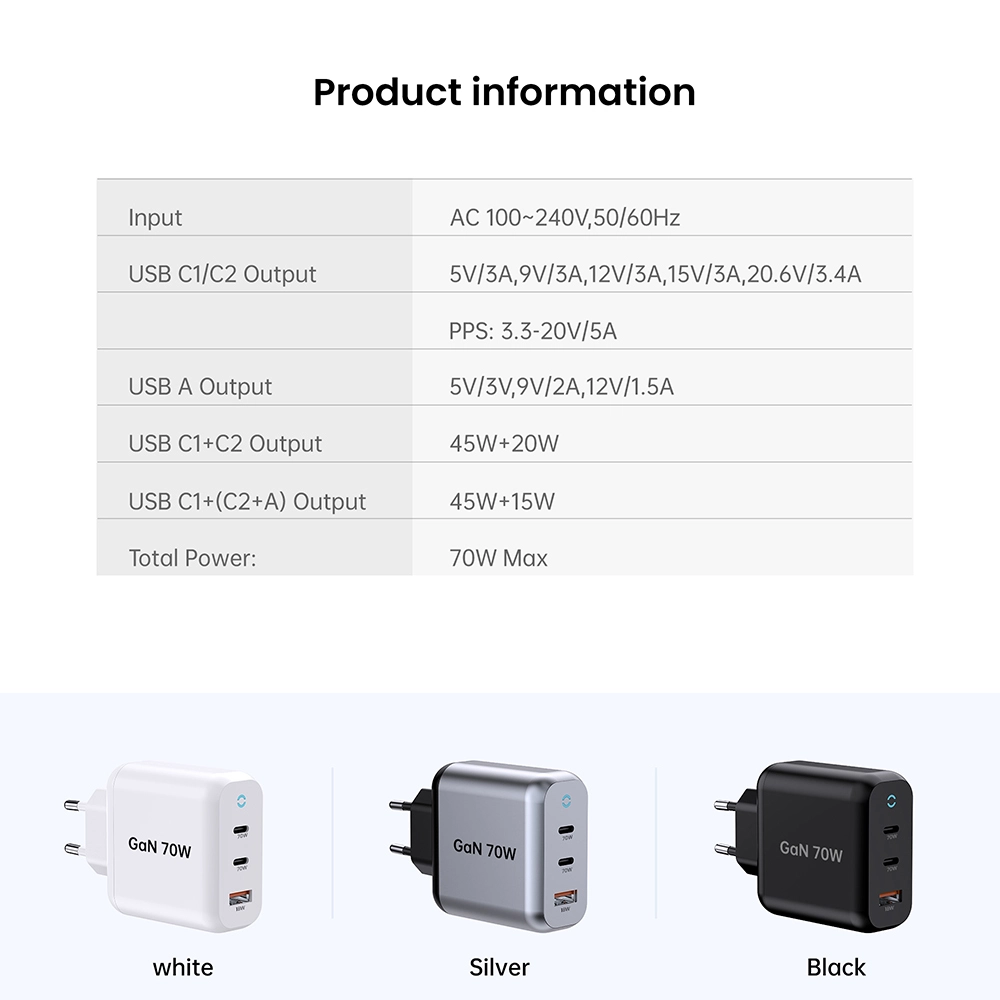 Έξοδος C1/C2: 5V3A,9V3A,12V3A,15V3A,20.6V3.4A (70W Max) PPS: 3.3-11V 4.05A Έξοδος USB-A: 5V3A,9V2A,12V1.5A 3.3-11V 2A(22W Max) Έξοδος C1+C2: 45W+20W Έξοδος C1+C2+USB-A: 45W+5V3A Σύνολο: 70W |