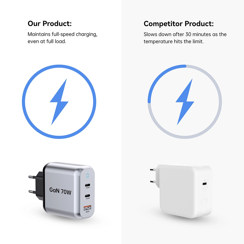 Ο ανθεκτικός γρήγορος φορτιστής 70W PD της Starwell για latpop tablet που ονομάζεται επίσης γρήγορος φορτιστής 70W GaN: 2C1A, καλύπτοντας την καθημερινή ανάγκη για γρήγορη φόρτιση κινητών τηλεφώνων και συσκευών tablet. Μικρό σε μέγεθος, ισχυρή απόδοση, με προηγμένη τεχνολογία νιτριδίου του γαλλίου. Όταν χρησιμοποιείται σε μία θύρα, η μέγιστη ισχύς εξόδου της διεπαφής USB-C1 είναι 70W. Όταν οι δύο θύρες χρησιμοποιούνται μαζί, το USB-C1 εξακολουθεί να διατηρεί γρήγορη φόρτιση PD 45 W. Υποστηρίζει πολλαπλά πρωτόκολλα γρήγορης φόρτισης, συμπεριλαμβανομένων των PD3.0, PPS, QC4+ και QC3.0, διασφαλίζοντας ευρεία συμβατότητα με διάφορες συσκευές